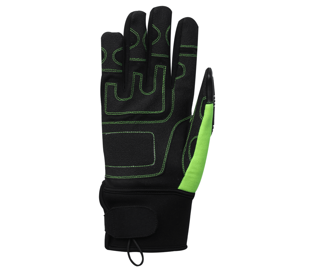 Enhanced palm grip with reinforced protection. Added EVA foam padding on the back. TPR elastomer strips on fingers and hand for extra defense. Reflective knuckle strip and red spandex back. Neoprene cuff with velcro closure. Convenient loop for hanging the glove.