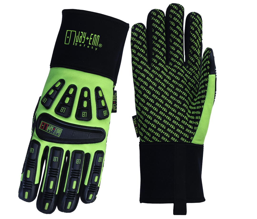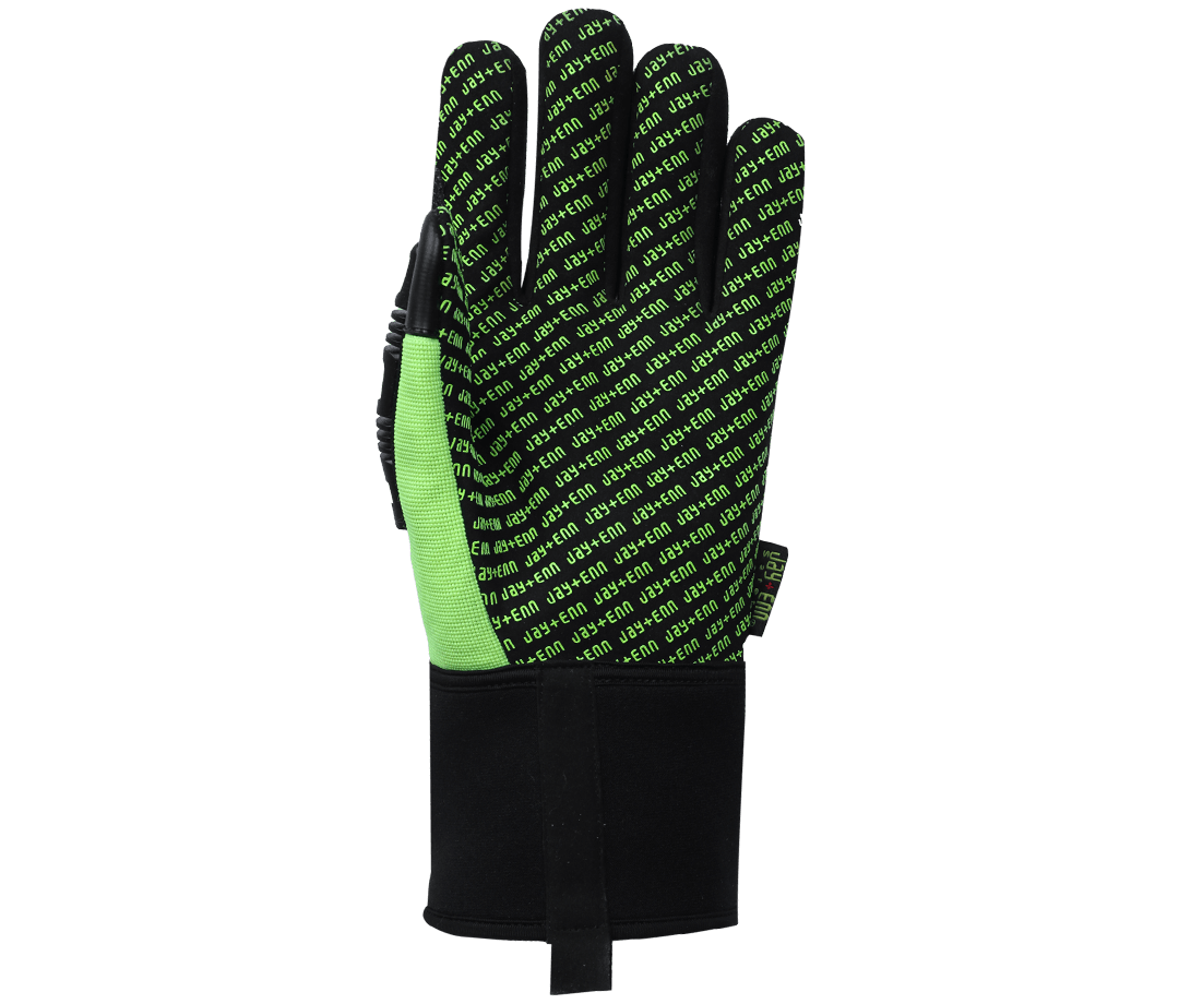 Silicone grip palm ensures secure hold. Back-of-hand impact protection. Double-stitched fingers and thumb for added durability. Abrasion-resistant thumb crotch. High-visibility green for safety. Neoprene cuff ensures easy on/off and secure fit.